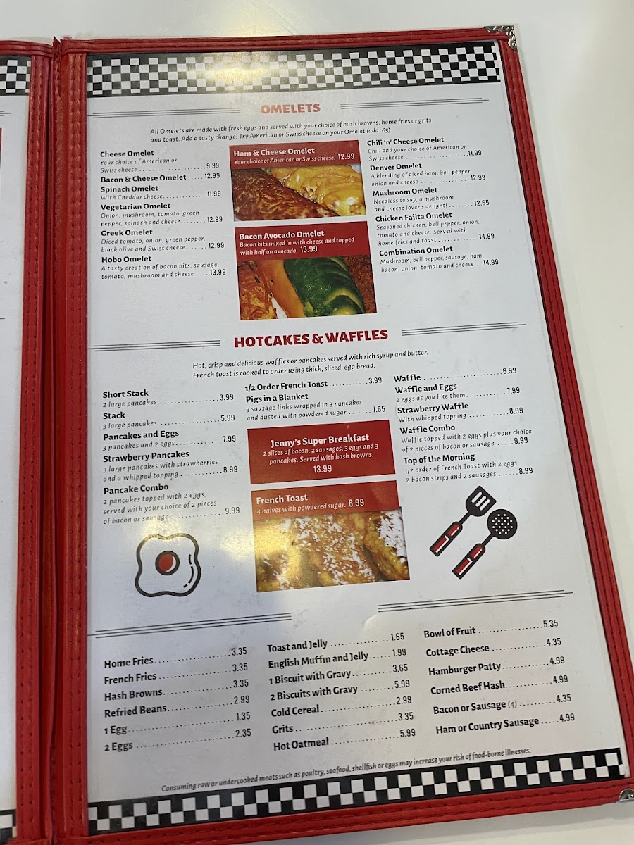 At Jenny's Diner, the menu is brimming with hearty options, catering to breakfast lovers all day long. Those seeking something savory will delight in the Fresh Vegetable Skillet, a vibrant medley of fresh spinach, onions, broccoli, tomatoes, and mushrooms, all lovingly scrambled with three eggs and crowned with Jack cheese and sour cream. Served on a bed of crispy home-fried potatoes, it’s a delightful way to energize your morning for just $16.99.